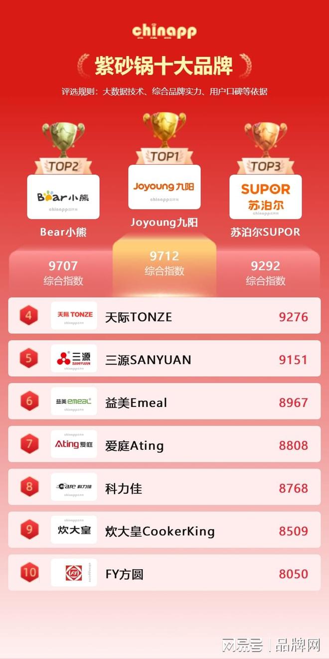 紫砂锅十大品牌排行榜,紫砂锅十大品牌前十名分别是:Joyoung九阳、Bear小熊、苏泊尔SUPOR、天际TONZE、三源SANYUAN、益美Emeal、爱庭Ating、科力佳、炊大皇CookerKing、FY方圆 。