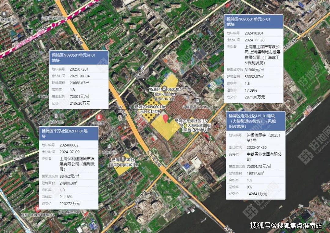 地块北侧是杨浦区N090601单元I4-01地块,出让面积16482.71㎡,容积率1.8,建筑面积29668.87㎡。地块起价213620万元,起始楼面价72001元/㎡。