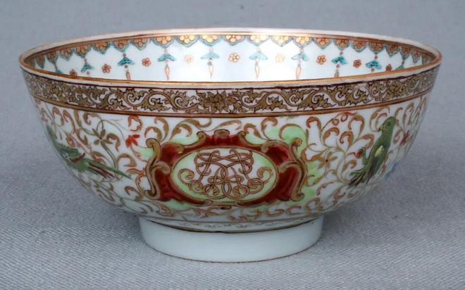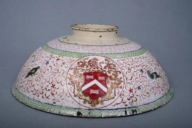 这件描金花卉纹碗是英国布特尔(Bootle)家族约1730年在广州定制的。西方人来华定制纹章瓷始于明中晚期,至18世纪渐趋普遍。这一时期,广州作为世界性的东方大港,是纹章瓷定购和出口基地。纹章瓷从广州起航,漂洋过海深入葡萄牙、荷兰、英国、法国、瑞典和美国等国家和地区,引领了西方崭新的生活方式和奢华的艺术情趣,同时也见证了中西贸易和文化交流的辉煌历史。