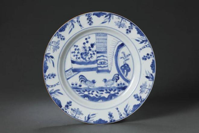 瑞典“哥德堡号”是瑞典东印度公司第二大商船,18世纪上半叶曾三次到广州贸易。1745年1月11日,“哥德堡号”第三次从广州启程回国,船上装载着茶叶、瓷器、丝绸和藤器等大约700吨的中国物品,船只航行到离哥德堡港大约900米的海面触礁沉没。这只瓷盘是“哥德堡号”沉船打捞出水的一件完整青花瓷,斗鸡纹反映了中国传统的民间风俗。