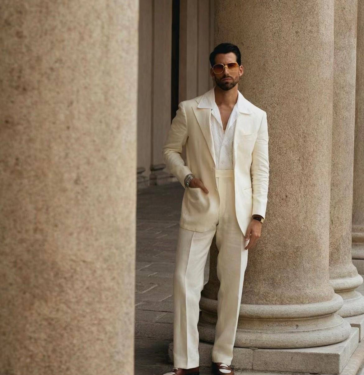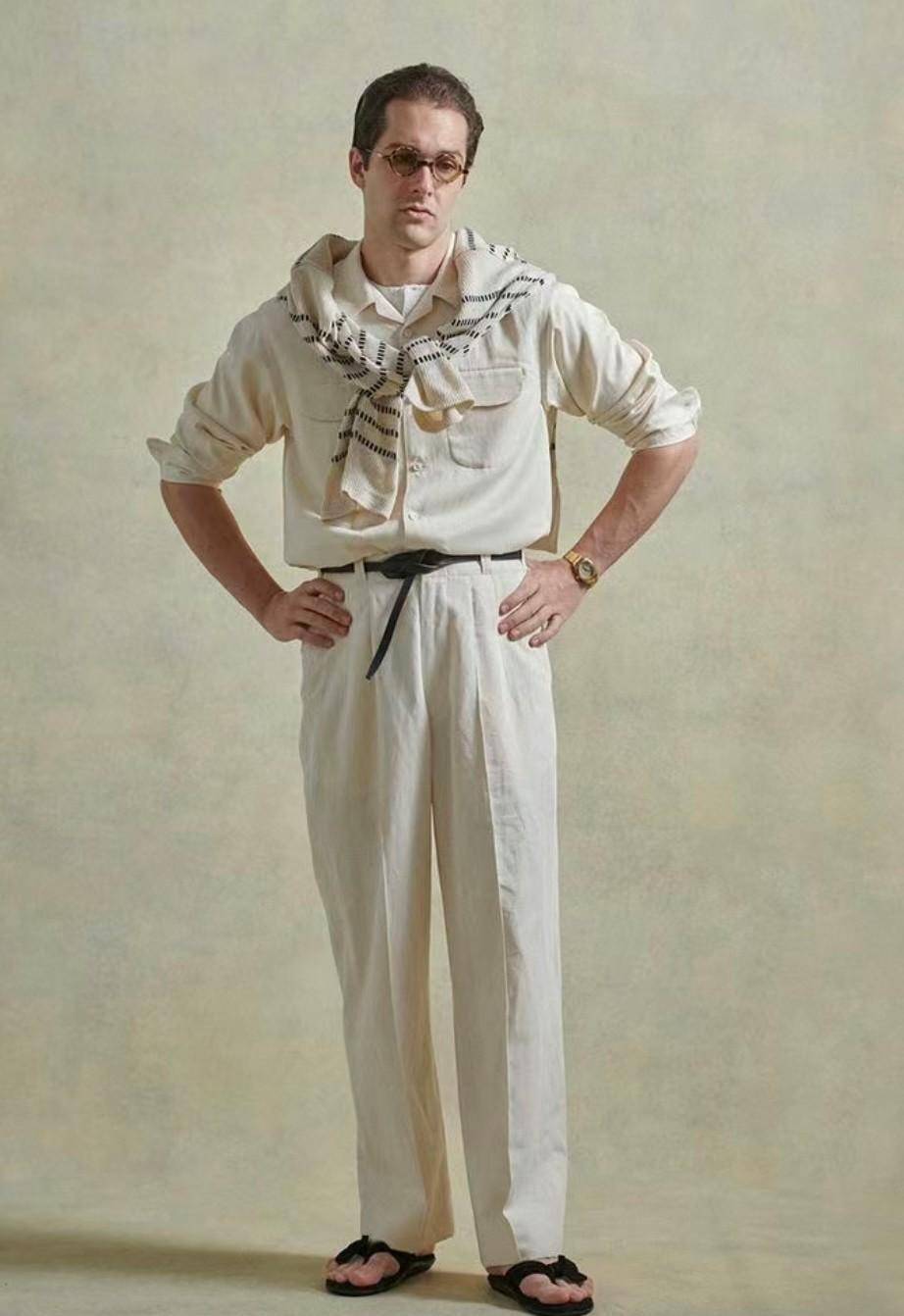 西装、皮鞋和领带常常是男士裤子的代名词。但白裤子确实不需要这些规则。小褶皱和高腰确保翻领衬衫能很好地塞进裤脚,线条比例也很突出。搭配西装穿在外面,就已经潇洒帅气了。
