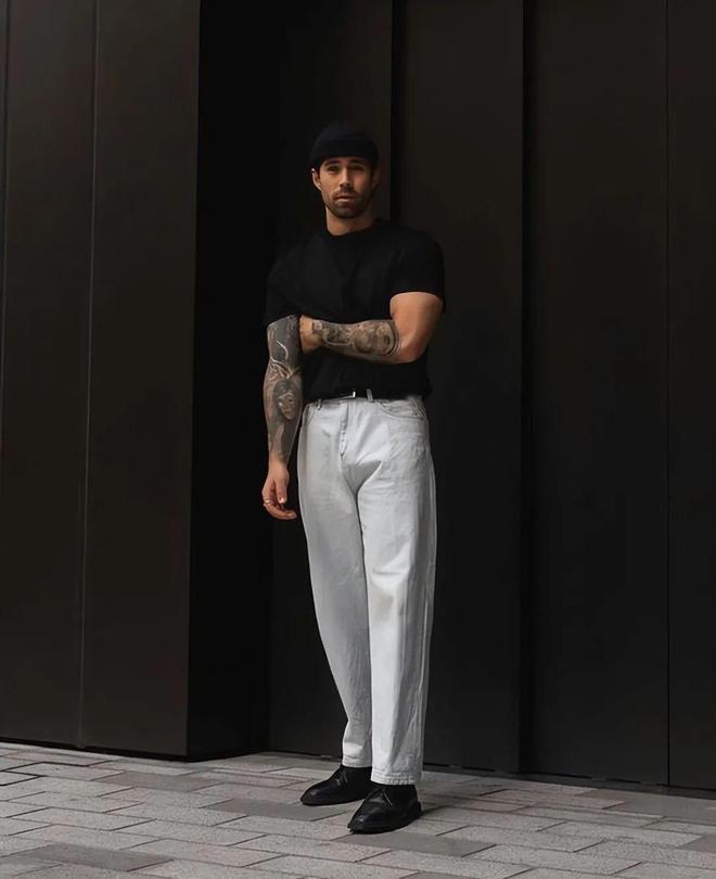 不过,说到底白色裤子最佳的搭档还是要数黑色上衣。这两种颜色怎么穿都不会错,白色的简约配上黑色的成熟,纯调色显瘦又时髦,绝对是懒人男士很好的选择。
