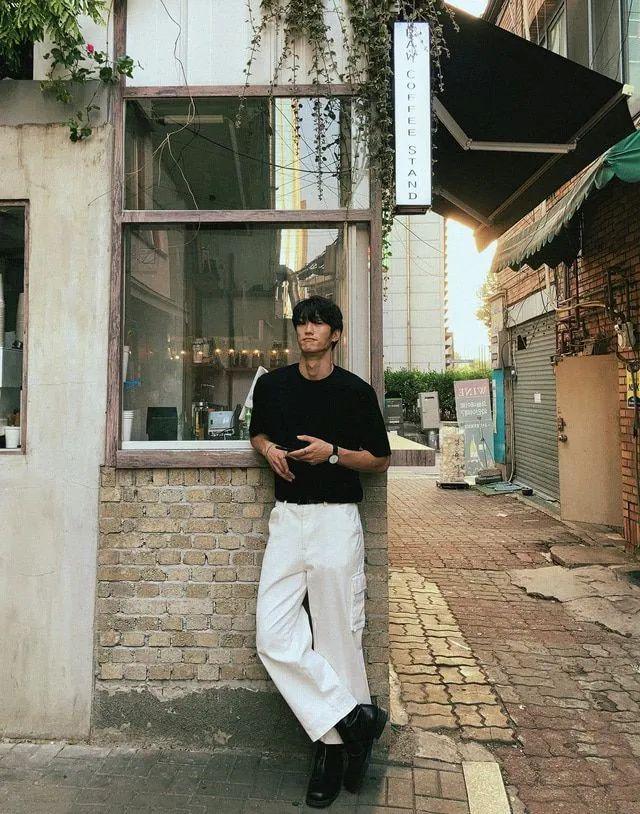 选择宽松的白裤子,实际上显胖的几率是很低的,高腰直筒的版型,除了修饰腿部之外,还可以提升你的腰线,优化整体的身型比例,搭配一件内塞黑T恤,加上复古皮鞋,整一身超有韩系男主韵味。